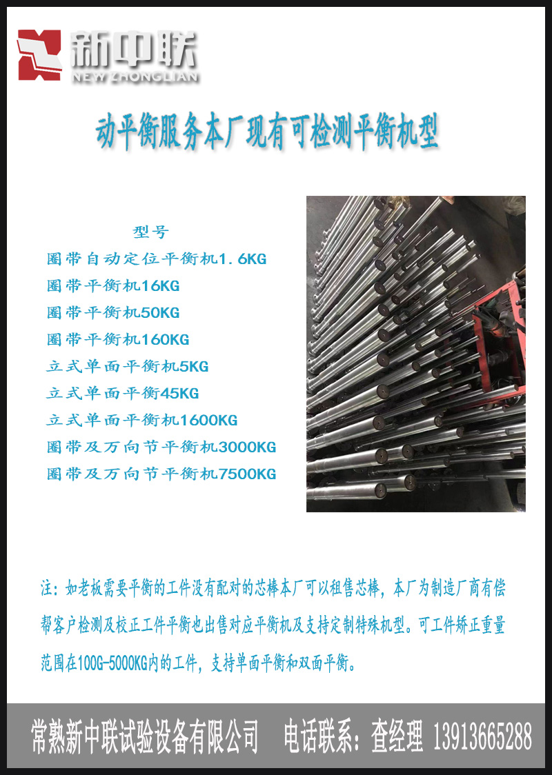常熟新中联试验有限公司承接各种工件动平衡服务,工厂自研制造动平衡机也提供各种样机为客户检测及校正工件平衡。